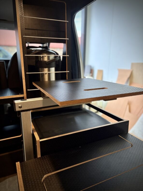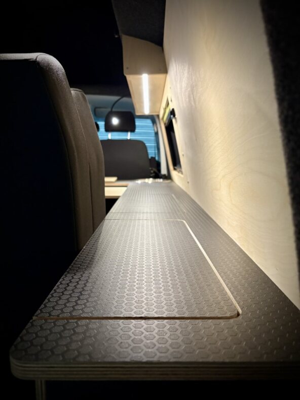 Crafted to fit your van perfectly using CNC. Designed around your needs, your gear, and the way you travel.
